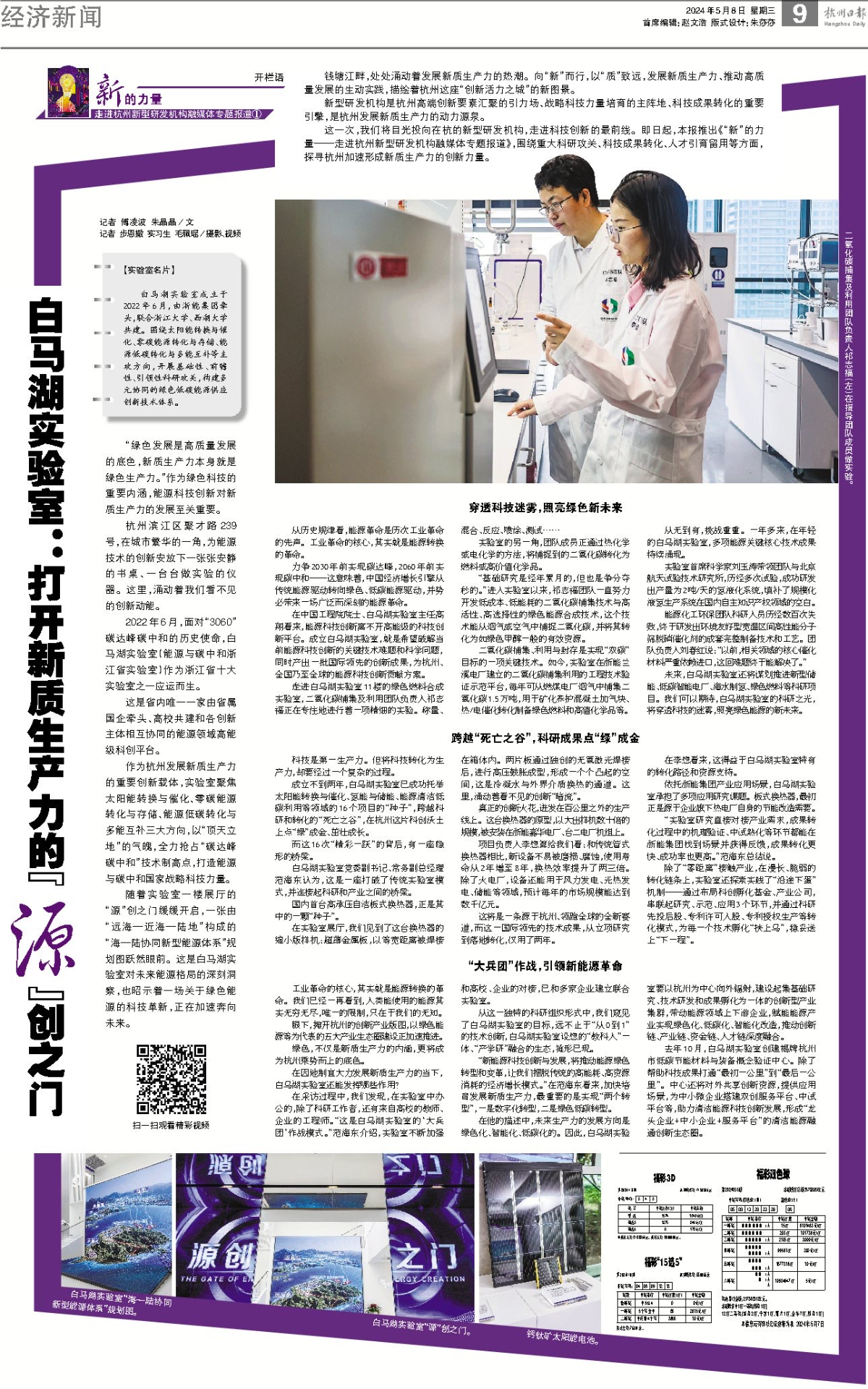向“新”而行,以“質”致遠。5月8日,《杭州日報》推出《“新”的力量——走進杭州新型研發機構融媒體專題報道》,探尋杭州加速形成新質生產力的創新力量,開欄首期整版報道《白馬湖實驗室:打開新質生產力的“源”創之門》。