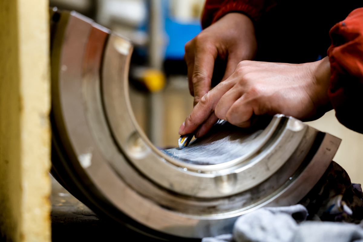 嘉電檢修人員手持“柳葉刀”進(jìn)行軸瓦修刮。 王侃 攝
