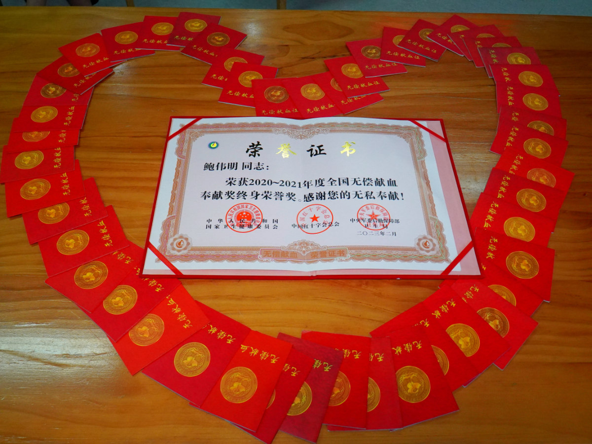 鋪滿宿舍的無償獻血證和榮譽證書見證了他25年的愛心征程。2023年獲得全國“無償獻血終身榮譽獎”至高榮譽;連續(xù)9屆榮獲全國無償獻血奉獻獎金獎(兩年一屆);2021年榮獲“浙江好人”榮譽稱號;2019年榮獲“金華好人”稱號;榮膺浙江省國資委“2014年度省屬企業(yè)最美員工”稱號。