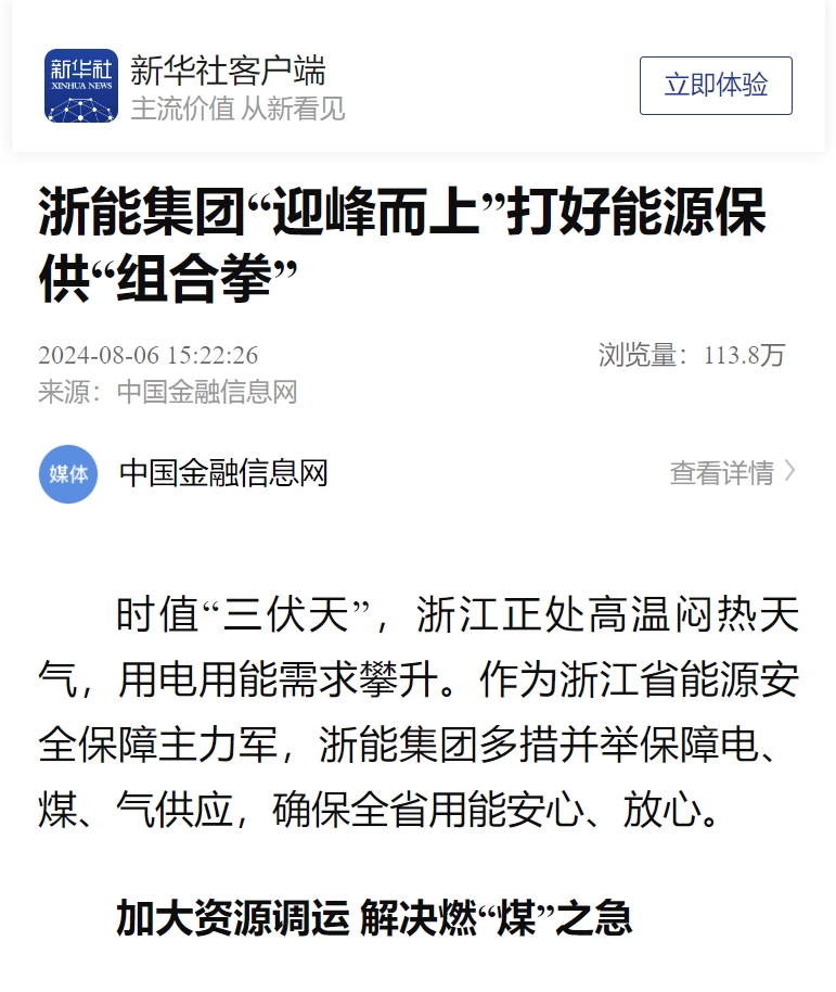日前,新華社刊登報道《打好迎峰度夏“組合拳” 浙能集團持續提升能源保供能力》,截至目前文章點擊量破百萬。