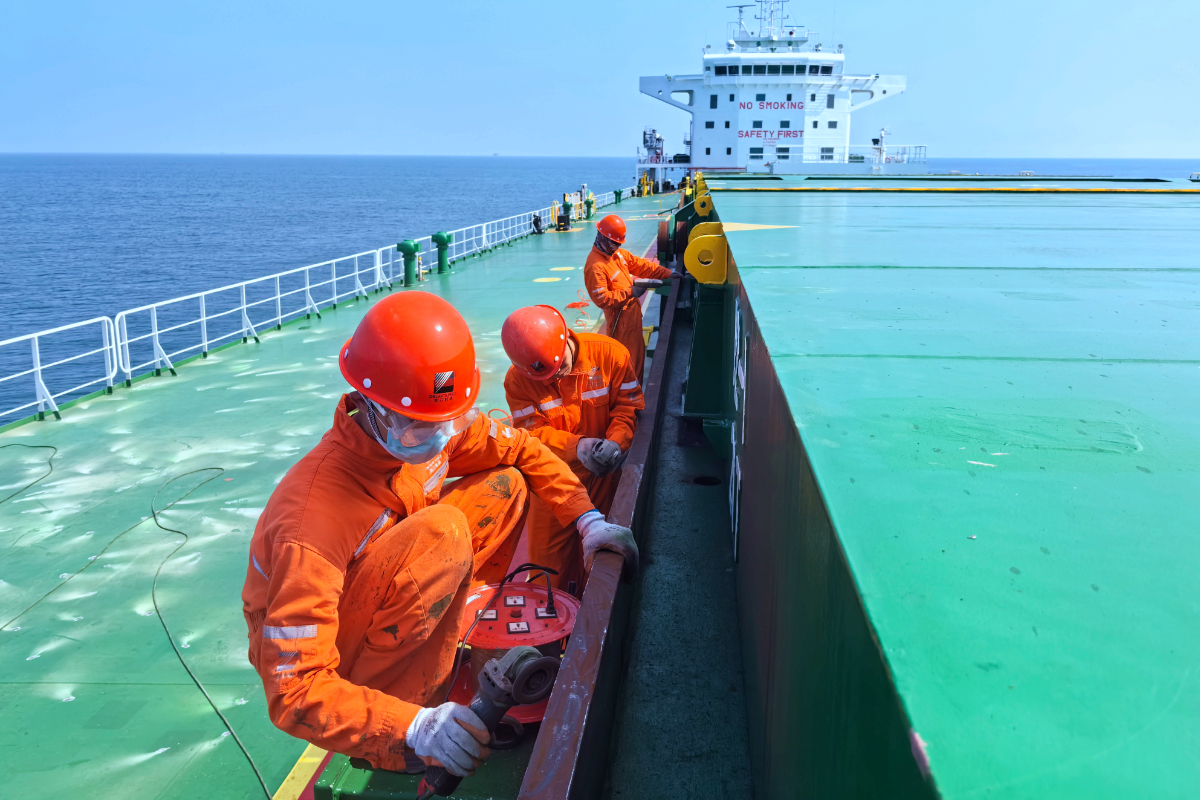 長袖長褲和大頭皮鞋的“反季”穿搭,一身汗水、滿臉灰塵,這是船員們的夏日寫真,橙、白、藍的堅守身影,在海上勾勒出一道靚麗的風景線。