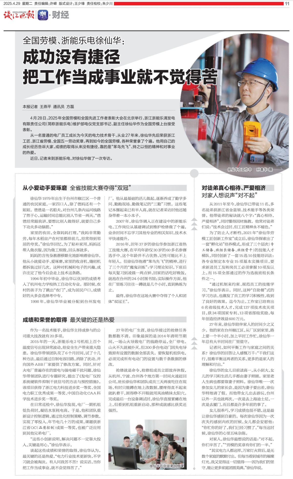 4月29日,錢江晚報報道《全國勞模、浙能樂電徐仙華:成功沒有捷徑,把工作當(dāng)成事業(yè)就不會覺得苦》。 錢江晚報 提供