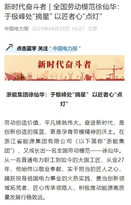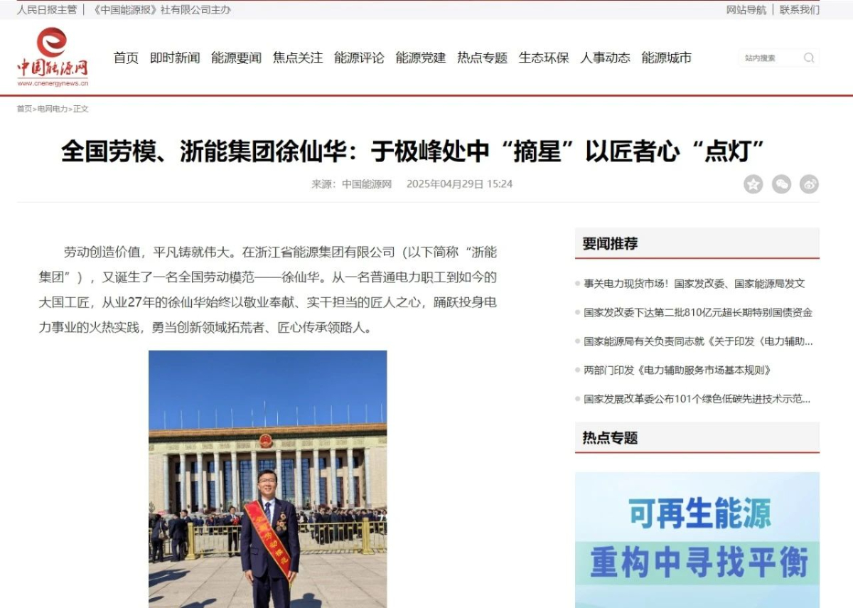 4月29日,人民日報旗下中國能源網(wǎng)報道《全國勞模、浙能集團徐仙華:于極峰中“摘星” 以匠者心點燈》 中國能源網(wǎng) 攝