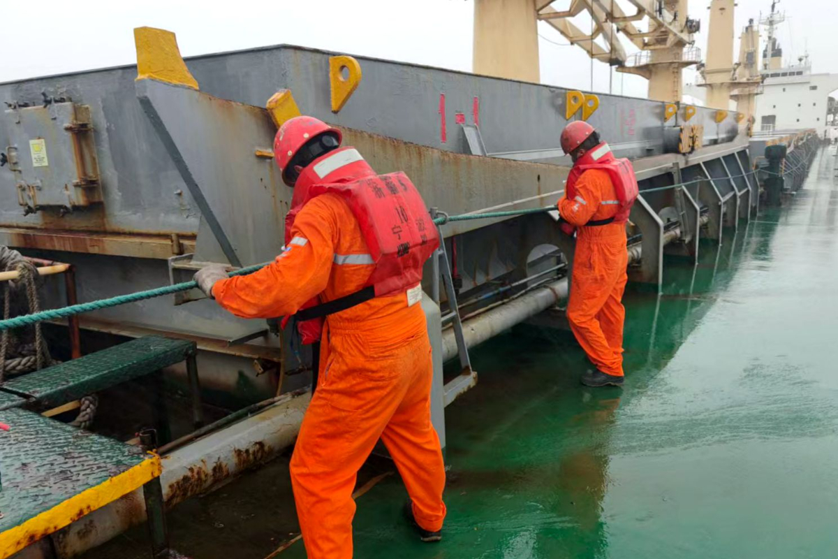 燃料供應(yīng)運(yùn)輸方面,各環(huán)節(jié)高效銜接、相關(guān)單位緊密協(xié)作,確保臺(tái)風(fēng)影響期間電廠電煤安全存量。圖為寧波海運(yùn)船員做好設(shè)備綁扎系固工作,確保臺(tái)風(fēng)期間船舶安全。 陳健慧 攝