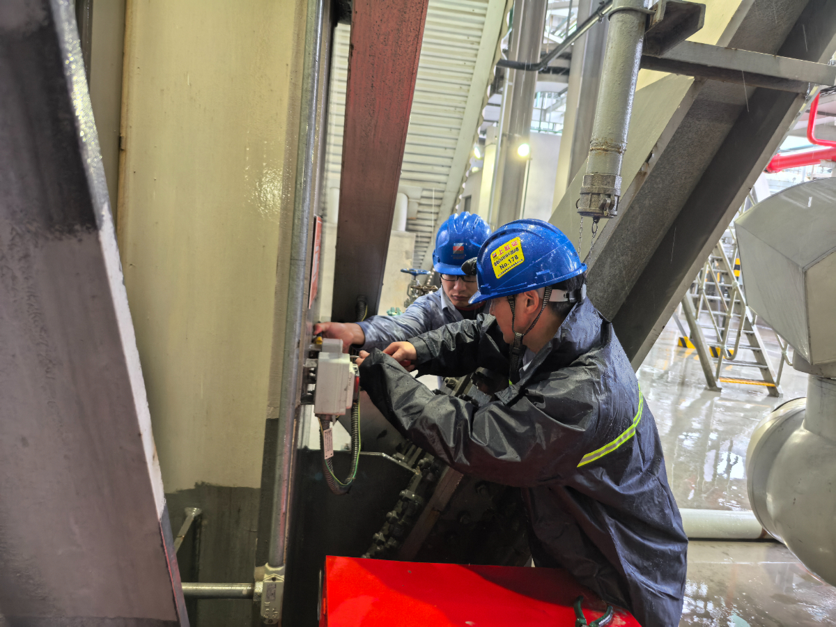 各單位嚴(yán)格落實(shí)值班值守制度,關(guān)鍵區(qū)域設(shè)備加密巡檢頻次,確保隱患險(xiǎn)情及時(shí)處置消除。圖為浙能鎮(zhèn)電維護(hù)部人員第一時(shí)間對(duì)臺(tái)風(fēng)過(guò)境期間暴風(fēng)雨引發(fā)的設(shè)備缺陷進(jìn)行妥善處理。 周鍵 攝