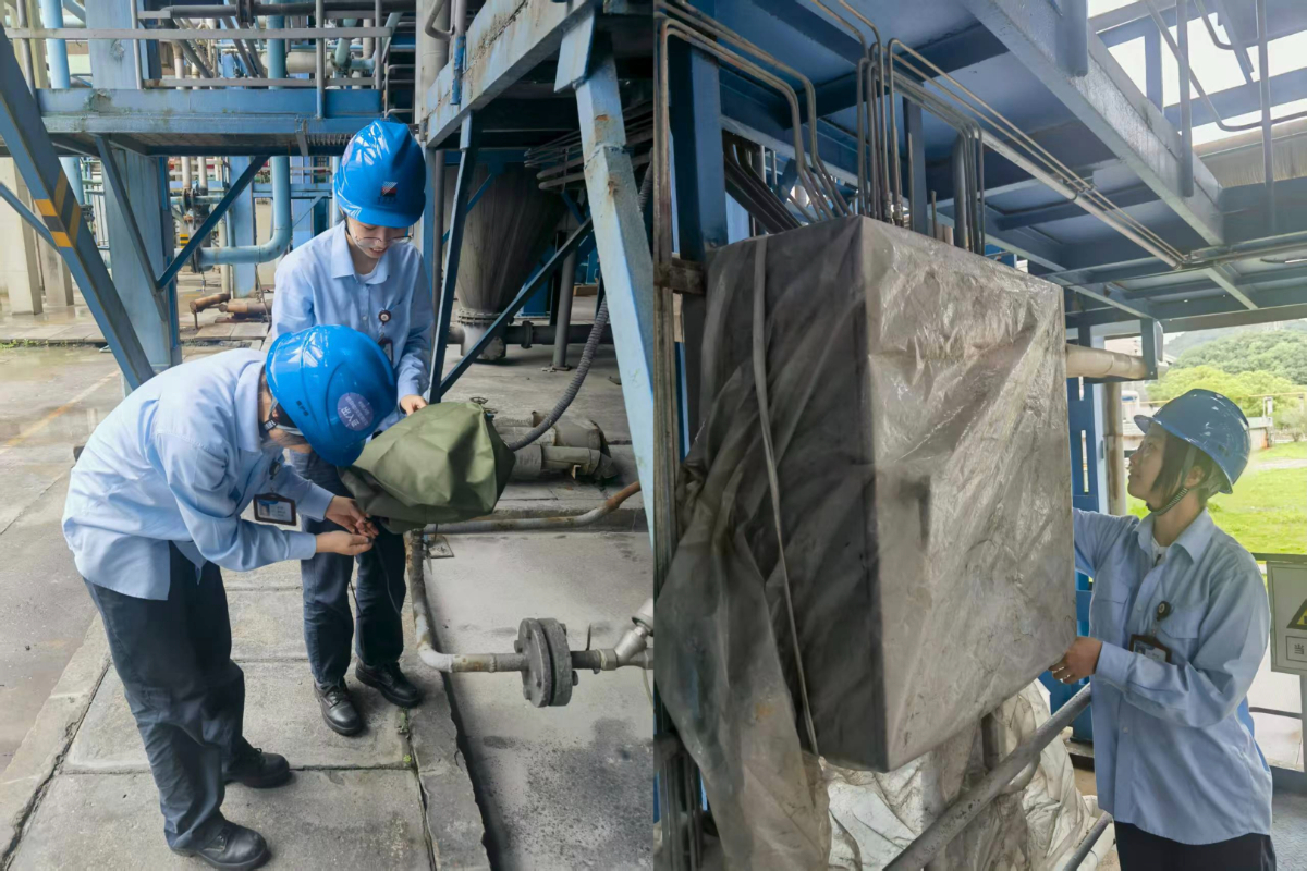 各單位以“橫向到邊、縱向到底”的標(biāo)準(zhǔn)迅速開展“拉網(wǎng)式”風(fēng)險(xiǎn)隱患排查。圖為臺(tái)州電廠維護(hù)人員檢查加固戶外設(shè)備防雨設(shè)施。 耿千舒 攝