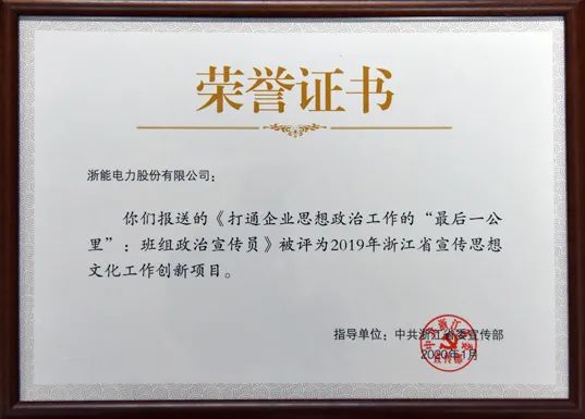 近日,從中共浙江省委宣傳部傳來好消息,浙能集團(tuán)報送的浙能電力《打通企業(yè)思想政治工作的“最后一公里”:班組政治宣傳員》被評為2019年浙江省宣傳思想文化工作創(chuàng)新項目,浙能集團(tuán)是兩家獲獎的省直單位之一,也是唯一獲獎的國有企業(yè)。