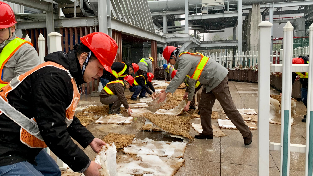12月18日下午,浙能長興發(fā)電公司燃機項目部黨員志愿者冒著風雪在廠區(qū)主干道鋪設防滑草墊,保障生產(chǎn)安全。 位亞飛 攝