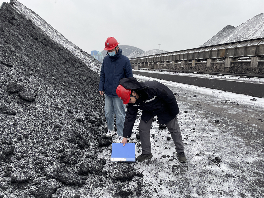 浙能富興燃料曹妃甸港口專用煤場上,駐港員正在查看凍煤。 崔巖 攝