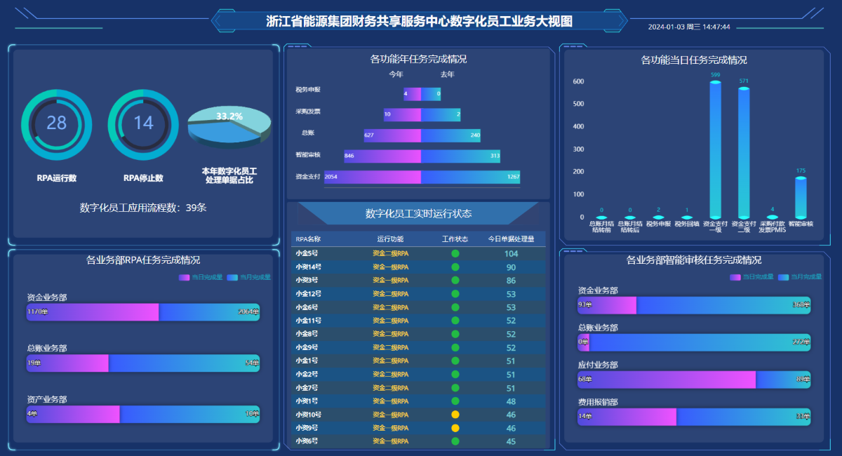 浙能財務(wù)共享運(yùn)營平臺上線以來已推廣21批線上運(yùn)行427家單位,開發(fā)129支標(biāo)準(zhǔn)化流程,與SAP等20個業(yè)財系統(tǒng)實(shí)現(xiàn)集成,覆蓋用戶3萬余人,從無到有打造以智能化、流程和數(shù)據(jù)驅(qū)動、業(yè)財稅資檔一體貫通、財務(wù)風(fēng)險控制和財務(wù)人才培養(yǎng)為主,富有浙能特色、不斷迭代升級、賦能價值創(chuàng)造的財務(wù)共享金名片,走在浙江國資國企前列。在數(shù)智化方面,該平臺采用統(tǒng)一架構(gòu)的端到端數(shù)字化平臺,利用IPA智能流程自動化、OCR智能審核、AI、NLP自然語言處理、全場景遠(yuǎn)程辦公等先進(jìn)技術(shù)手段,搭建起流程、審核、運(yùn)營和數(shù)治四個方面組成的智能應(yīng)用體系,實(shí)現(xiàn)憑證和支付自動化率雙雙超過99%,其中數(shù)字員工、數(shù)字化監(jiān)督看板、智能語音提單、智能派單、智能客服等一批功能應(yīng)用頗具特色、業(yè)內(nèi)領(lǐng)先,榮獲上國會“2022年智能財務(wù)最佳實(shí)踐年度綜合大獎”。