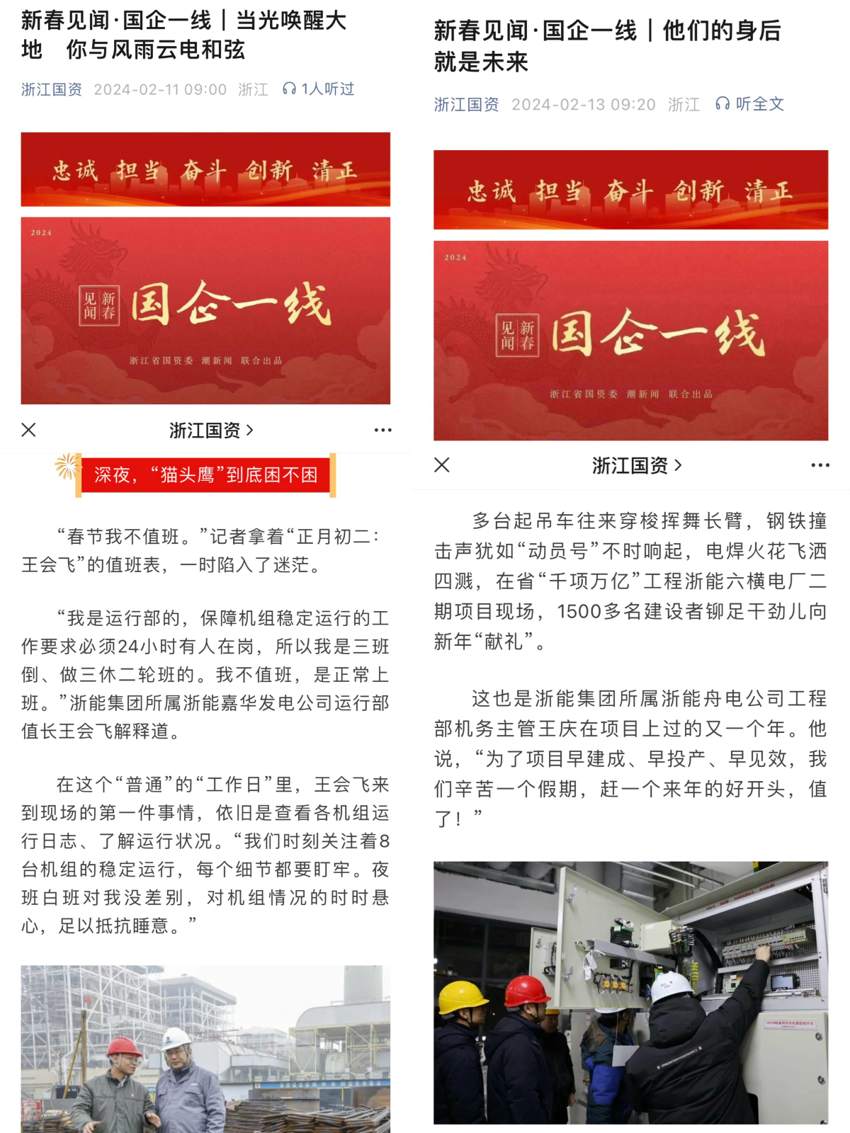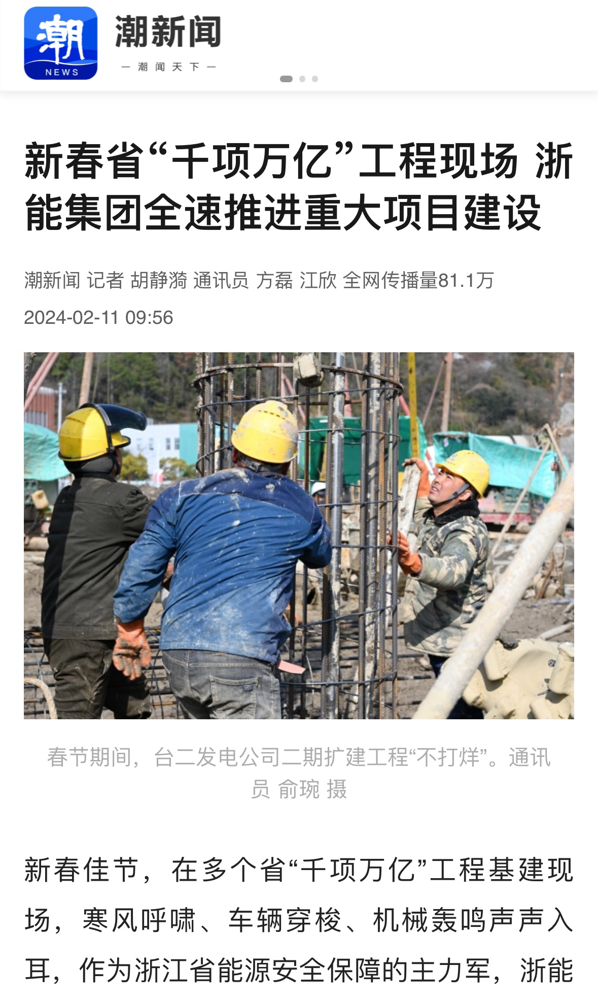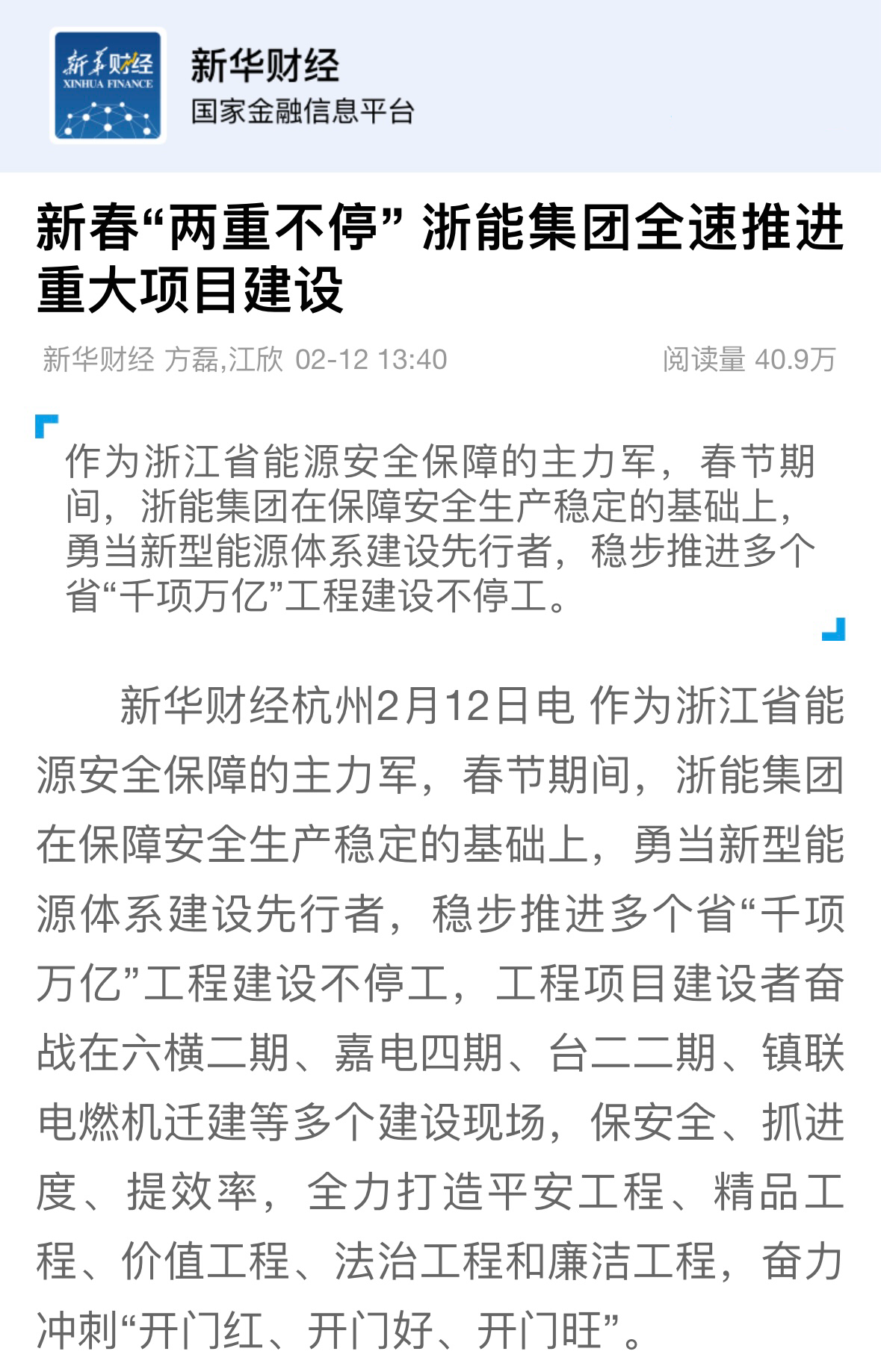浙江國資公眾號報道《沖刺“開門紅”浙能集團推進“千項萬億”工程建設不停工》。 浙江國資公眾號 圖